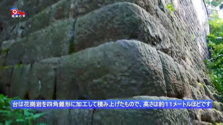「ウルミル台はチェスン台*5など、ピョンヤン城の7カ所の将台のうち、コグリョの築城技術が最も立派に反映されている代表的な将台のひとつです。それは北の方の城のチェスン台と比べてみますとよくわかります。チェスン台は峰にそのまま、低い基壇をつくって、その上に将台を建てたかと思えば、このウルミル台は同じ将台なのに、自然の地勢を利用して前へ突出させた城壁の一部分に石をきちんと積み上げて高い台を作り、そこに楼閣を建てて将台としました。これはチェスン台を始め他の将台と区別されるウルミル台の特徴だといえます」