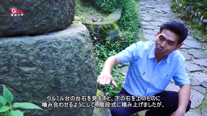 「ウルミル台の台石を見ますと、下の石を上のものに噛み合わせるようにして、階段式に積み上げましたが、これはコグリョの代表的な築城方法の一つです。台の上には兵隊が身を隠して矢をいるのに有利なように胸壁を作りましたが、ここには遠いところのものと近いところのものを撃つための穴が一定の間隔で配置されています」