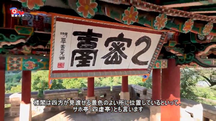 「台の上の楼閣は平屋の二重入母屋作りの形を取っていますが、楼閣は四方が見渡せる景色のよい所に位置しているといって、サホ亭(四虚亭)とも言います」