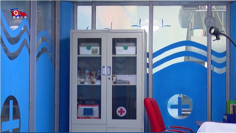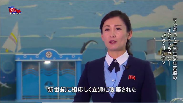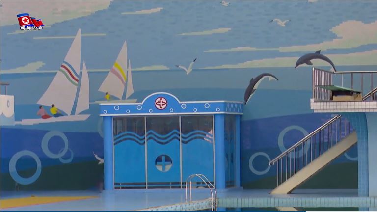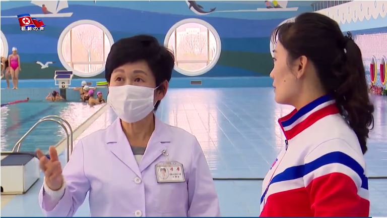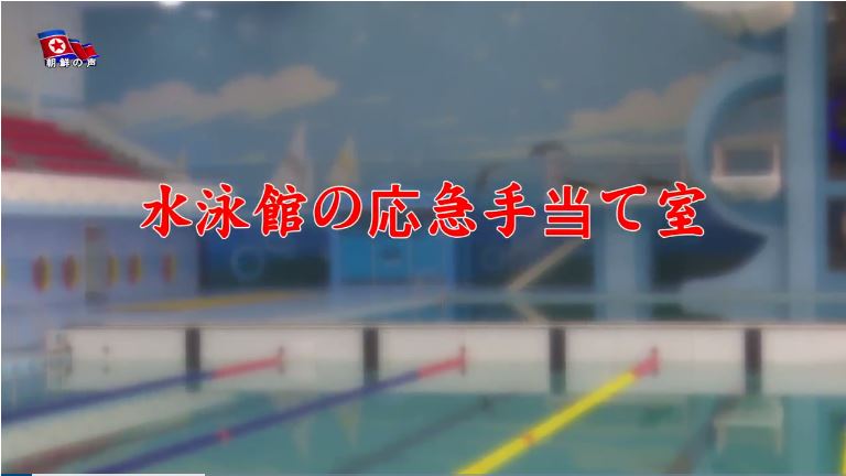 「2015年11月30日、敬愛する金正恩総書記は、新世紀に相応しく立派に改築されたマンギョンデ学生少年宮殿を訪れ、ここ水泳館にも寄りました。新しく造られた水泳館を明るい笑顔で見た総書記は、ふと水泳館の応急手当て室はどこにあるかと聞きました。質問の深い意味を認識できなかったある幹部が、宮殿にクリニックがあります、と答えましたが、総書記は顔を曇らせました。そして水泳館には応急手当て室を造って、患者がいる時はクリニックまで背負っていくのではなく、応急手当て室で治療を受けるようにすべきだと言いました」