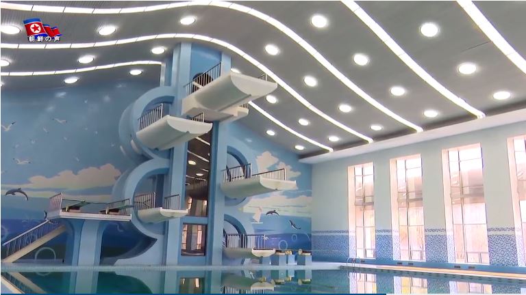 金正恩総書記は一年前にも万景台学生少年宮殿を訪れて、水泳館の跳躍台と天井の間の空間を確かめ「これから国際競技も出来るように、もっと立派に造るべきだ」と教えました。