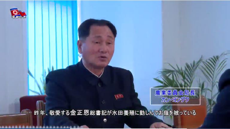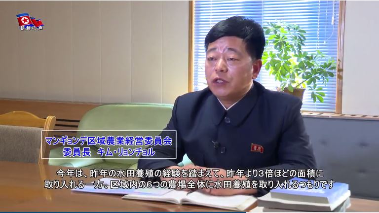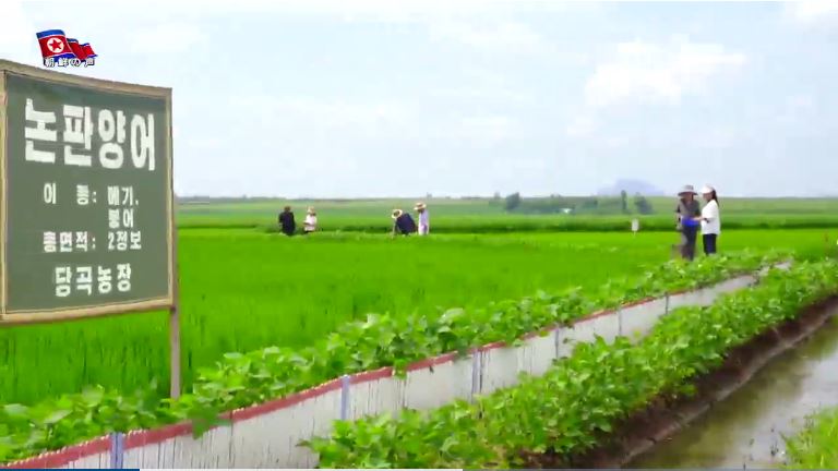 「昨年、敬愛する金正恩総書記が水田養殖に勤しんでお陰を被っている人民軍で運営するある農場を訪れて以来、農業委員会管轄の2000余りの農場で水田養殖を行い、低収穫地の水田で多くの穀物と魚を生産しました」