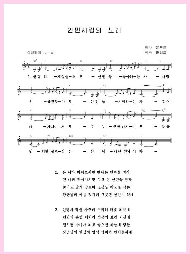 「『人民愛の歌』、この歌の1番では新しい家を訪ねても、また、街の公園などを訪ねても金正日総書記が先ず聞くのは人民が喜んでいるのか、この言葉だと歌っています。そして、2番では外国訪問の途中も祖国の人民に思いを馳せ、その人民のために全てを捧げた総書記の苦労について感動深く歌い上げています。3番では人民の楽土を築き、その人民を守るため雪の日、雨の日をいとわず、苦労も楽しみとした総書記の人民愛にふれ、広い海のような、高い空のような総書記の一生を綴るのは人民だと歌っています」