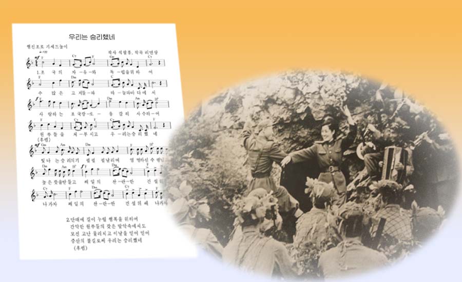 1950年から1953年まで朝鮮ではアメリカの武力侵攻を退ける熾烈な祖国解放戦争が行われました。「われらは勝利した」、この歌はこの戦争に勝利した朝鮮人民の喜びと誇りを高らかに歌いあげています。チュチェ42(1953)年に出ましたが、ソク・パルボンさんが歌詞を書き、人民芸術家の称号を受けたリ・ミョンサン*1さんが曲を付けました。