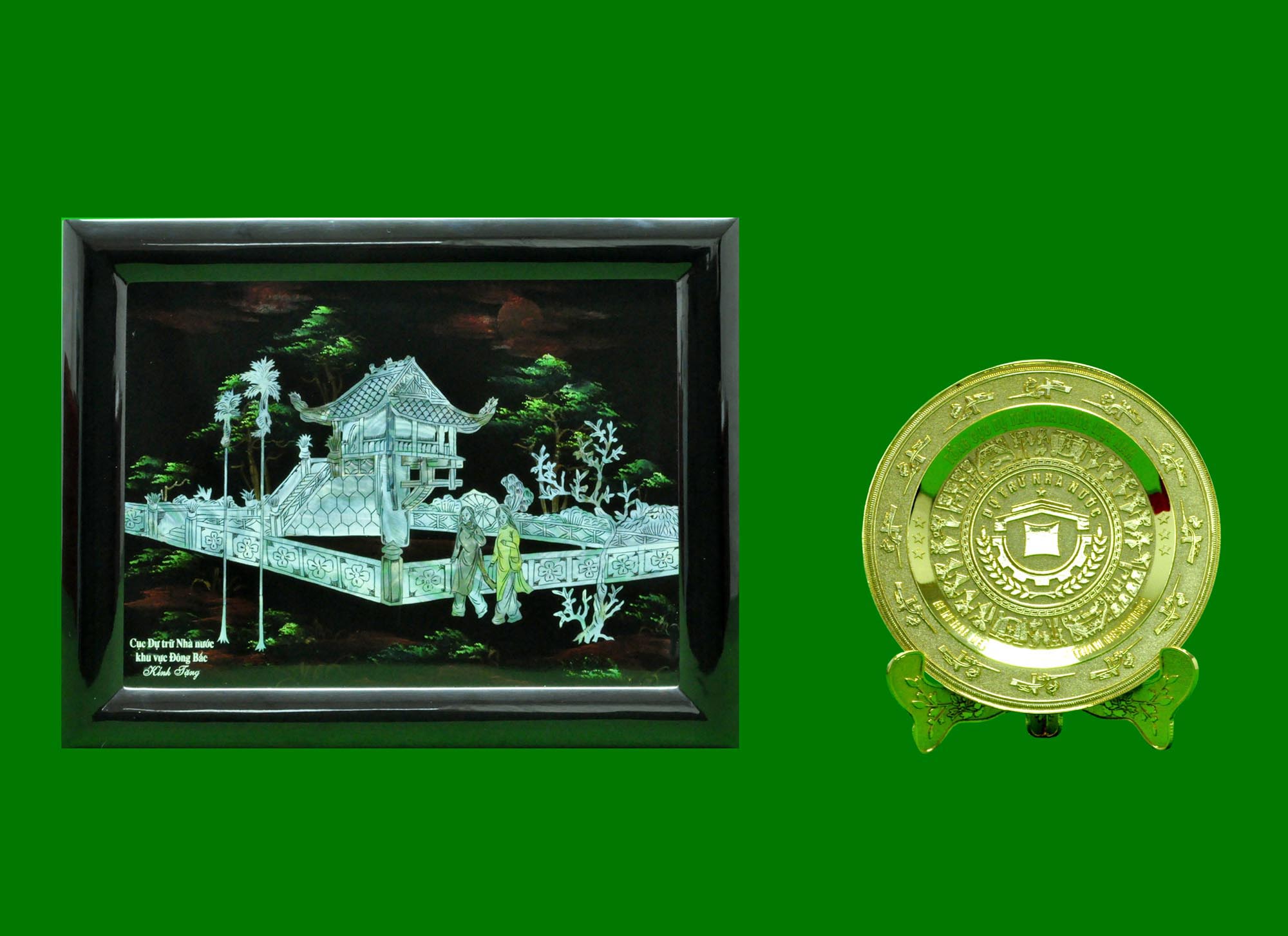 チュチェ101(2012)年12月11日、ベトナム国家貯蔵総局の北東地域国家貯蔵局から金正日総書記に贈られた螺鈿細工の「独柱寺」と金属工芸「ベトナム国家貯蔵総局のマーク」です。螺鈿細工はベトナムの首都ハノイにある「独柱寺」と言うお寺を表したものです。家を支えている柱が一つしかないことで有名なお寺は独特な建築美を誇っています。金属工芸「ベトナム国家貯蔵総局のマーク」の中心には工業を象徴する歯車と農業を象徴する稲穂が浮き彫りになっています。そして金属工芸品の縁には健康と長寿、純潔を象徴する12匹の鶴といろいろな文様が刻まれています。