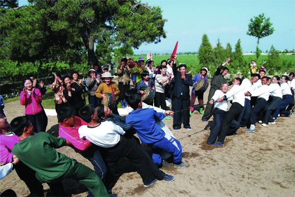祝日や休日は、どこを見てもスポーツで賑わっています。職場と作業班、居住人民班、分組別にチームを組んで行う多彩な試合は、シーソーゲームの展開となり、応援者は手に汗を握って見守っています。一番の見ものは、伝統のスポーツ種目の1つである綱引きです。このように、勤労者は喜びに満ちて楽しい休みの一日を過ごし、大衆スポーツを通して集団の団結と和睦を図ります。