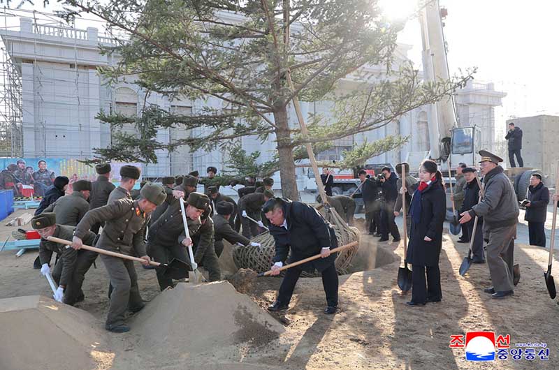 金正恩総書記は、指導幹部と共に記念館の園林造成計画に従って行われる植樹の初の鍬入れを行った
