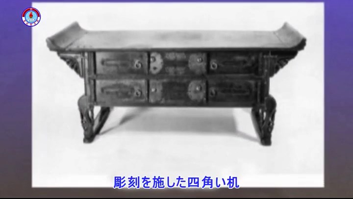 箪笥、彫刻を施した四角い机、木靴、木の印鑑箱