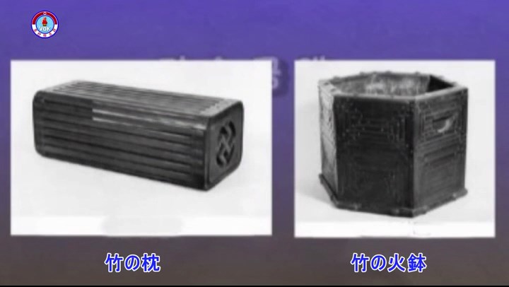 彫刻の食膳、銀を象嵌したタバコ入れ、竹の枕、竹の火鉢、木製の被り物の保管箱、彫刻を施した木製の糸巻き