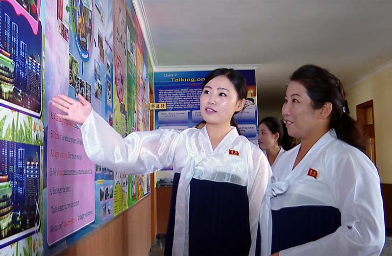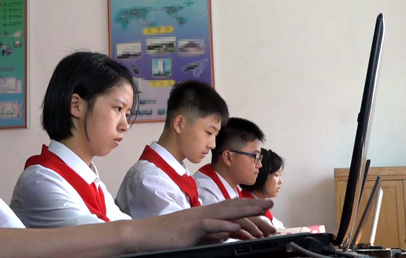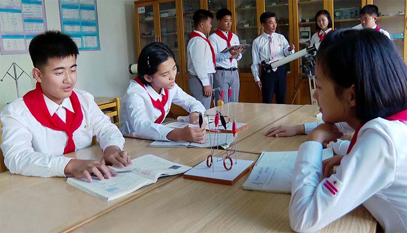 キムヒョンジク師範大学*1付属のテドンガン区域*2ルンラ高級中学校*3は、生徒の学力や向学心が強いことで知られています。上級学校に進む卒業生の数も毎年、ピョンヤン市で上位に入っています。その秘訣は、新機軸の教授方法を編み出すことを重視し、粘り強く進めているからです。