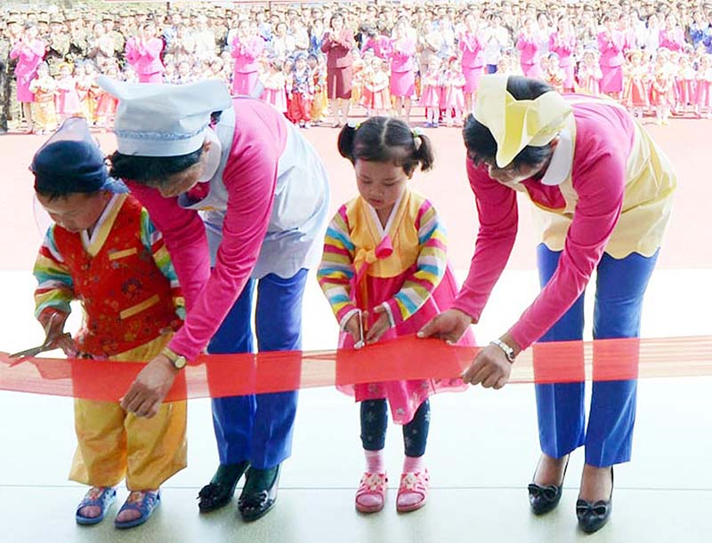 チュチェ104(2015)年6月1日の早朝、竣工式を控えたウォンサン育児院、愛育院を訪れた敬愛する金正恩総書記は、竣工式の時、子供たちにテープカットをさせよう、そうすれば大人になっても小さな手で我が家のテープを切った日のことを生涯忘れないだろう、と言いました。