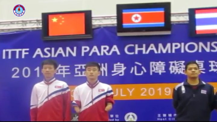昨年7月23日から27日まで中国台北*2で“2019年世界卓球連盟アジア障碍者卓球選手権大会”が行われました。団体戦TT6部類、TT7部類に出場したチョン・ジュヒョン選手とキム・ヨンロク選手は準々決勝で南朝鮮チームを、準決勝でタイ・チームを下し決勝進出を果たしました。