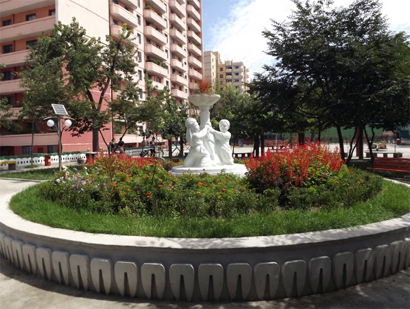 調和の取れた整然とした佇まいのアパートと公共施設、住宅エリアは緑一色です。歩道も新たに敷き詰められ、広い空地には色々な果樹や花木が植えられました。ユニークな造りの公園には、色々な運動機材や乗り物などが完備しています。青葉生い茂る木陰の下では、将棋、ユッ遊び、こま遊戯などを楽しめます。芝生にはクマ、ウサギなどの彫刻があり、あたかもメルヘンの世界に入ったような感じです。