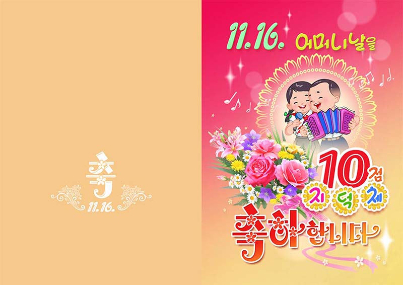 母の日が日一日と近付いていた2012年11月のある日も、総書記は母の日を迎えて祝賀状を年賀状を作るように立派にデザインすべきだとし、いろいろな形式のデザインを早く作るべきだ、と強調しました。