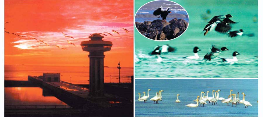 西海閘門*1の冬鳥棲息地は西海閘門水域にあり、ナンポ市*2のワウ島*3公園からリョンナム里*4までの道路の左右1キロメートルの域に跨っています。