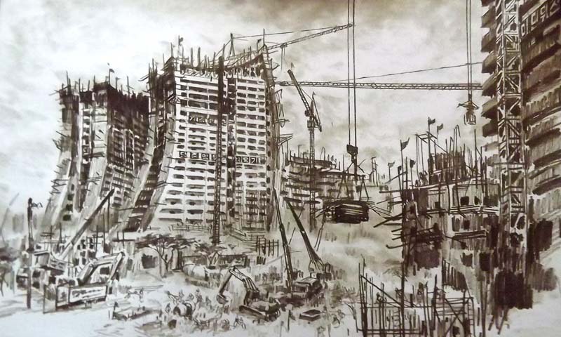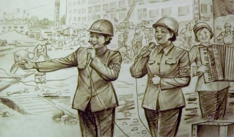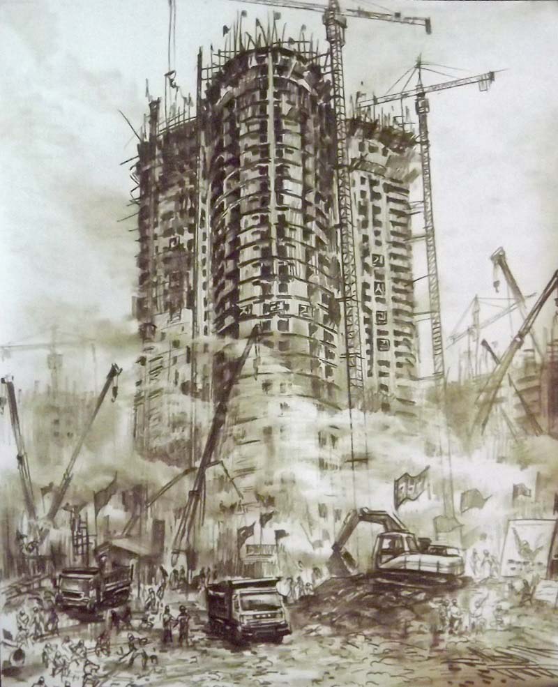 画集には昨年の街の起工式から今年の新居入りまで納められています。昨年、この建設に携わる姉から、私たちの暮らすピョンヤンにまた一つの素晴らしいニュータウンが建てられるとの話を聞き、またテレビを通じて住宅建設の着工を知らせる発破の場面も見たリさんはそれを自分の絵に託しました。それ以来、リさんは姉の話や写真、自分が直に見たことなどを全て描きました。