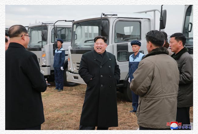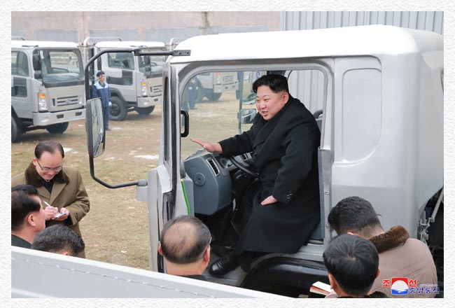 チュチェ106(2017)年11月のある日、金正恩委員長は当時のスンリ自動車連合企業所を訪れました。金正恩委員長は、広々としたパークいっぱいに並んでいるトラックを見て、労働者たちが自力で意気込んで作り出したチュチェ朝鮮のトラックだと喜びました。そして、トラックに乗って、直接運転しながら、性能や技術的特性について確かめました。
