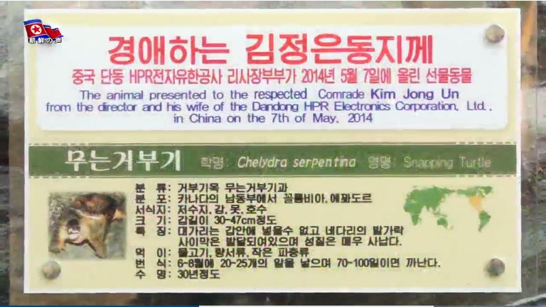 ここに〓〓〓〓のカミツキガメがいますが、このカミツキガメは敬愛する金正恩総書記に2014年5月7日、中国の丹東HPR電子会社の理事長夫婦から贈られたものです。