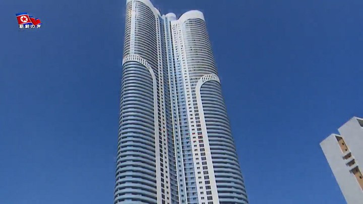 松花通りのこの超高層アパートは『労働者アパート』と呼ばれています。超高層アパートの高さと同じく勤労する人民の地位は天に届き、報いの思い愛国の思い、また大きくなりました。