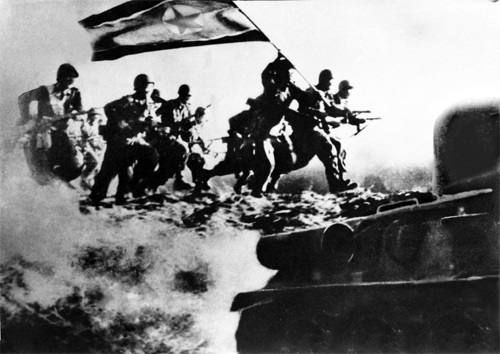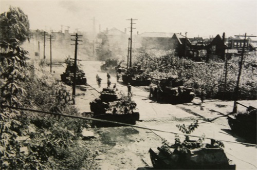 金日成主席の命令により、戦車の連合部隊の攻撃についで歩兵の連合部隊が敵軍の側面と背後を打撃し、ソウル市街に攻め入りました。あっという間に敵軍の防御陣地は崩れました。