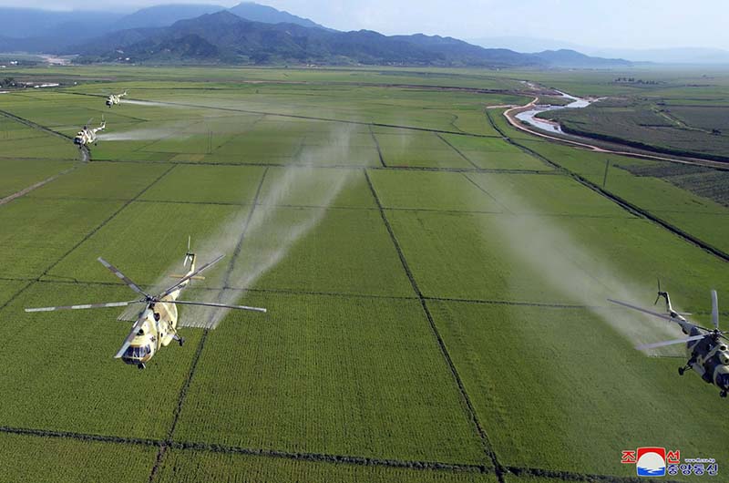 この8月、朝鮮では集中豪雨と津波の被害が一部の地域に出て、水田が冠水しました。金正恩総書記は台風に見舞われたカンウォン道*3アンビョン郡*4オゲ里*5一帯の被害現場に行って、冠水した水田の復旧作業を直々に指揮し、穀物の収量に影響が出ないよう必要な対策を取りました。数日後、再びここを訪れた金正恩総書記は、冠水した田んぼの農作物の生育状態を改善するための対策として、人民軍部隊の飛行機を動員するよう取り計らい、農薬散布の全過程を指揮しました。