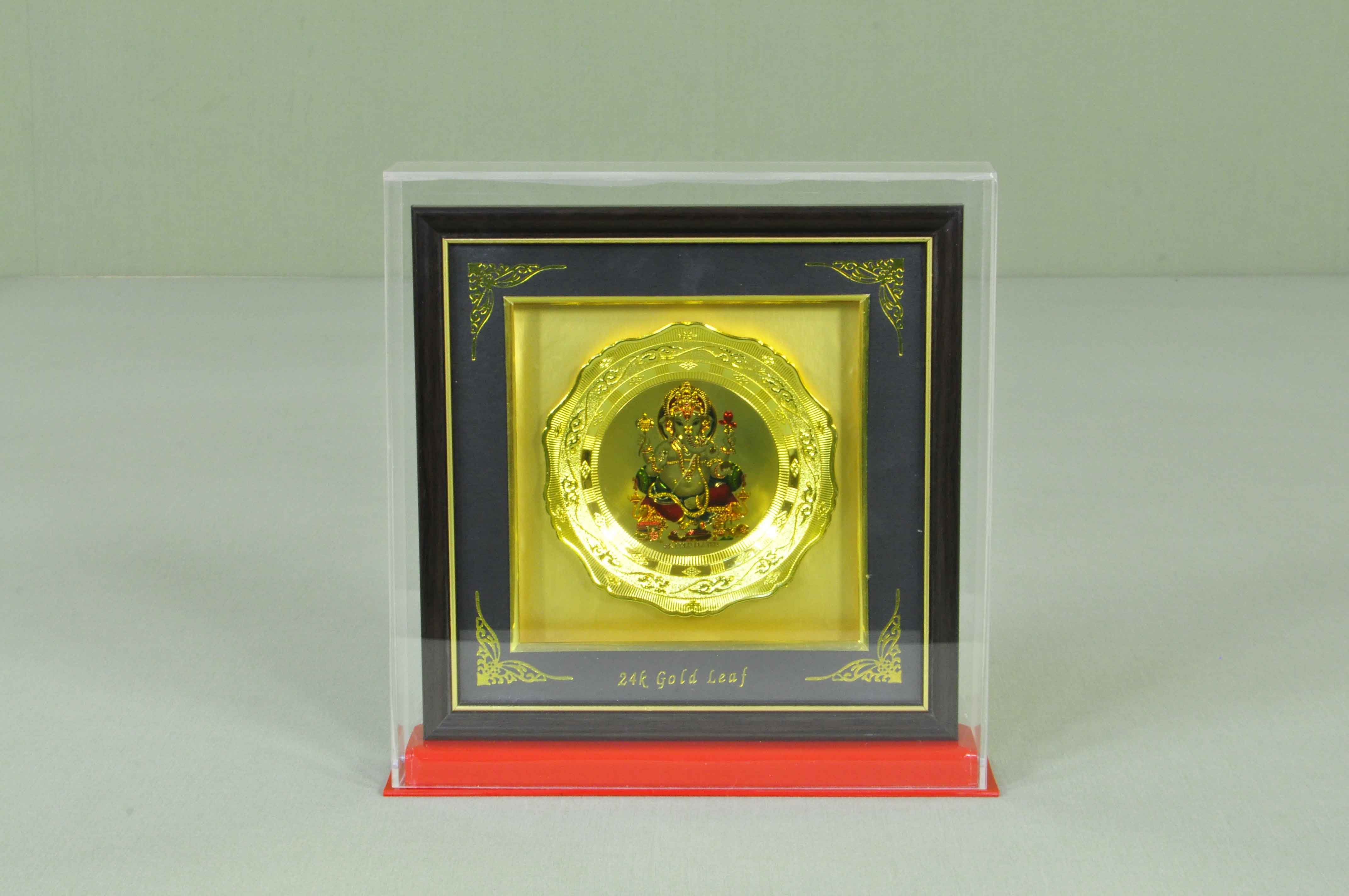 額縁の中の丸い皿の形の工芸品にはヒンズー教が崇める「ガネーシャ神」がデザインされています。