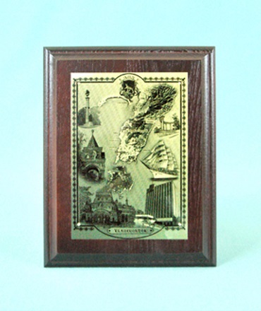 贈り物にはウラジオストクの発展の歴史を象徴する内容の絵が描かれてあります。長さ26.5センチ、幅20.5センチで、黄色の金属板にレーザーで刻んだ絵を木の額に固定させたものです。