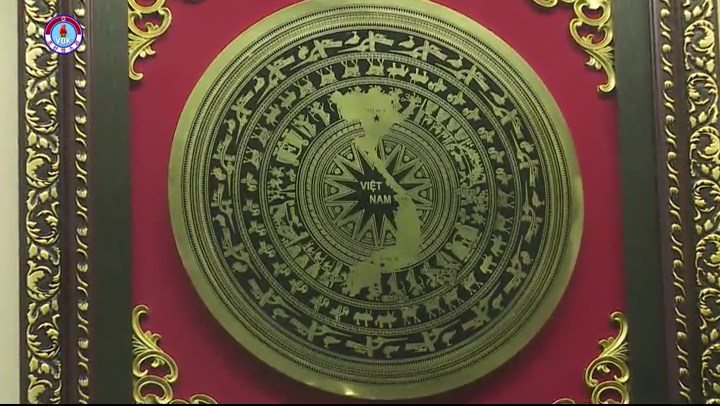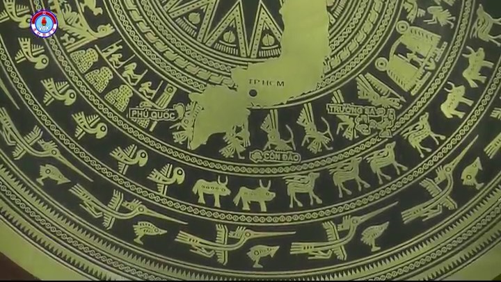 古代、ベトナムの人達が使用した銅の鼓を表わしたものです。鼓の中心部にはベトナムの地図が、その周りには鶴をはじめ色々な獣と紋様が描かれています。