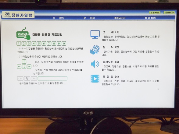 目の不自由な人のためのキーボードは点字形式のものであり、ドッドプリンターによる閲覧サービスが提供されます。耳の不自由な人はディスプレーに表示される字幕と手話動画を通じてコンテンツを十分理解できます。閲覧室にはまた書架エリアが設けられていて、障害者は各分野の常識の資料を閲覧できます。