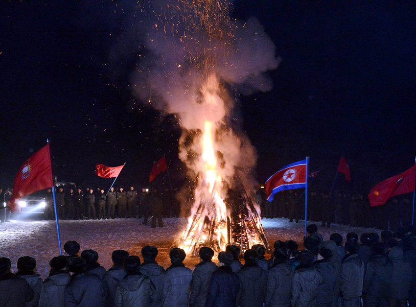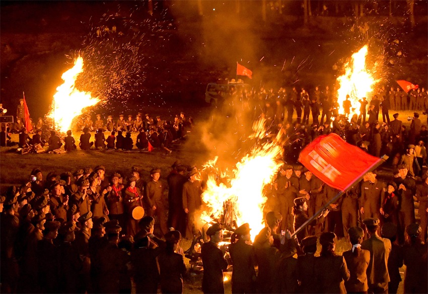 青年たちは社会主義朝鮮をより富強な国にするため、国のいたるところで奇跡のような偉勲を立てています。青春の歌声ひびく社会主義の建設現場には、いつも焚き火が燃え上がります。青年たちが焚き火を愛するのは、その炎がまさに偉大な金正日総書記が点じた熱い愛国献身の炎だからです。