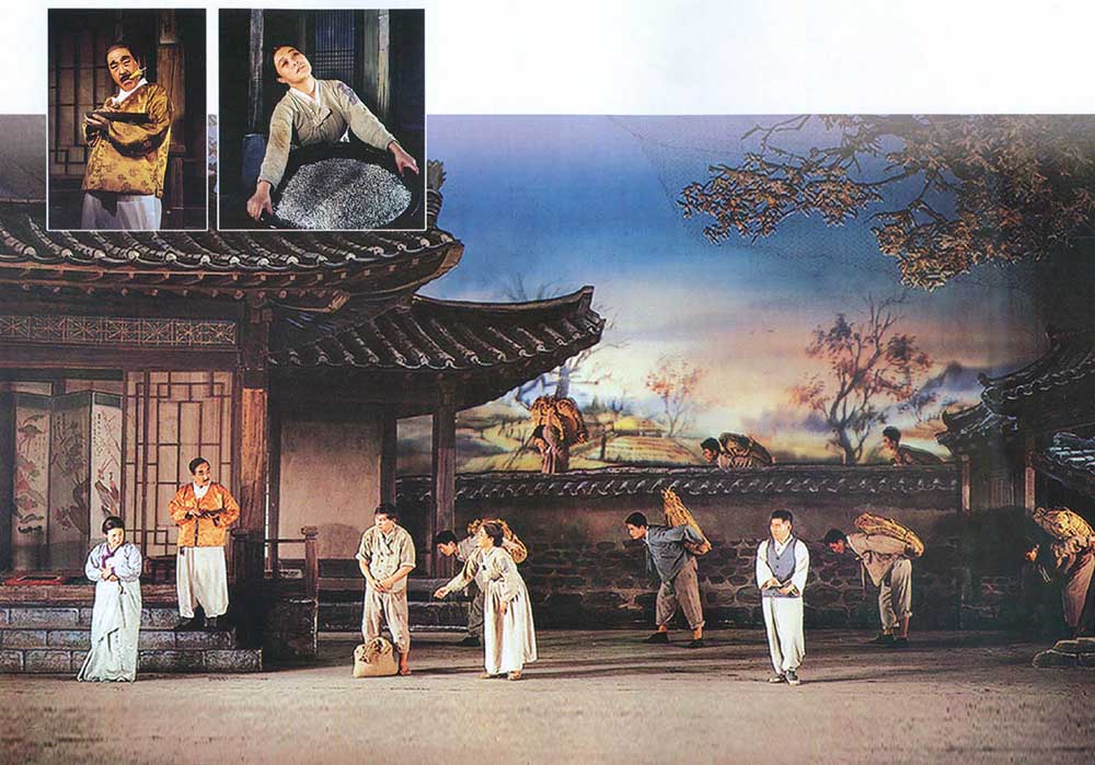 革命歌劇「花を売る乙女」は、歌詞の各節を同じ旋律でくりかえす有節歌謡によって劇的感情を交わす新しい様式を創造し、全ての歌謡が名曲揃いです。また、登場人物の行動、歌、対話などでは表現しきれない主人公の心のうちや劇の進行を説明するため、舞台の外で歌う歌、いわばパンチャン、傍唱を取り入れましたが、それは劇の状況に合わせて、男女それぞれの大小のパンチャンと混声パンチャン、そしてソロやデュエットのパンチャンのような新しい形式のものでした。