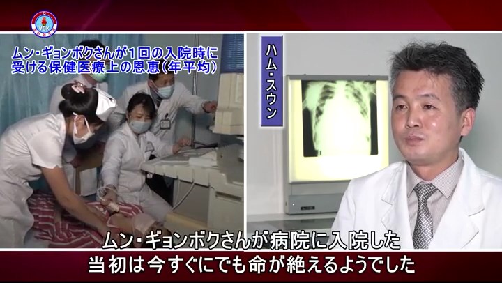 「朝鮮でムン・ギョンボクさんのような重患は各病院に固定の患者として登録され、日常的な医学の監視と対策が取られているだけでなく、随時、入院治療と療養治療を受けるよう計らっています。居住地域の食品店では栄養剤を切らさず供給しています。その費用は全て国持ちです。つまり、国が個々人の生命の安全に全責任を負っているわけです。そこで条件をつけたり、打算したりすることなく、患者を無条件回復させること、これが私たち医師の姿勢と立場です」