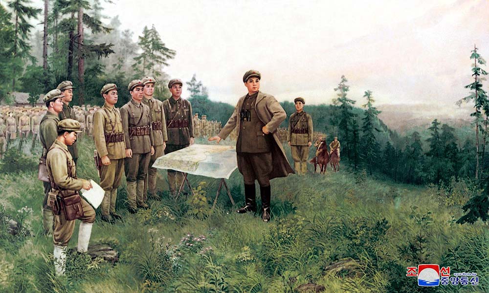 ところが多くの屍をさらしても降伏しない敵軍は、岩や木に頼って必死になって対抗しました。主席は戦況をすばやく見抜いて、革命軍の損失を減らし、敵軍を全滅させる新たな作戦を練り、戦闘を勝利へと導きました。朝鮮人民革命軍はこの戦闘で「討伐の王者」を名乗る前田をはじめ、140人以上を殺傷し、30人以上を捕虜にして、多くの軍需物資を鹵獲しました。