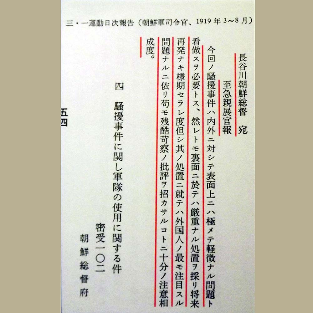 当時日本の総理大臣が「朝鮮総督」に送った電文には、朝鮮人民の3月1日人民蜂起について、対外的には表面上、極めて微々たる問題と見せかけ、内的には容赦なく弾圧することを指示した内容があります。日帝は、朝鮮駐留軍と警察部隊、さらには日本人居留民まで武装させて、蜂起の弾圧に駆り出し、それでも物足りず、日本本土の兵力まで引き入れて、大々的な弾圧に出ました。
