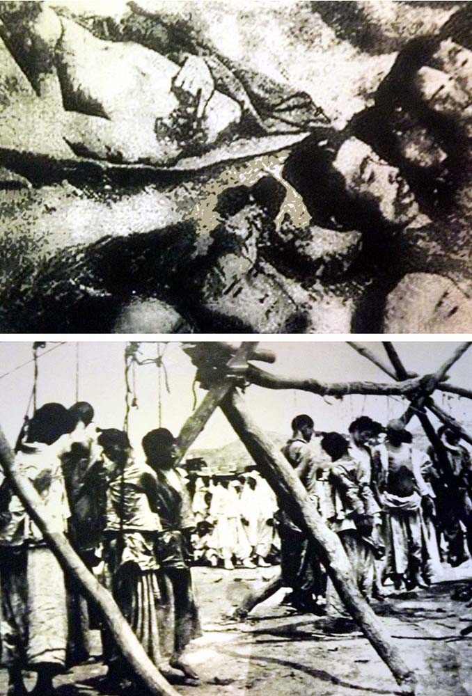 日本のある御用学者は、日本人は見るに耐えないほど残酷な弾圧に出たとし、日本憲兵の残酷さは筆舌に尽くしがたく、年寄りと婦女、子供まで銃剣で刺し殺し、首を吊って殺したと言いました。当時の惨状を目の当たりにした一人の外国人は、あまりにも凶悪な、また残酷な行為で、人間の耳で聞いては信じられないほど、人間の意思では理解できないほどの人間対野獣の行為そのものだったと証言しました。