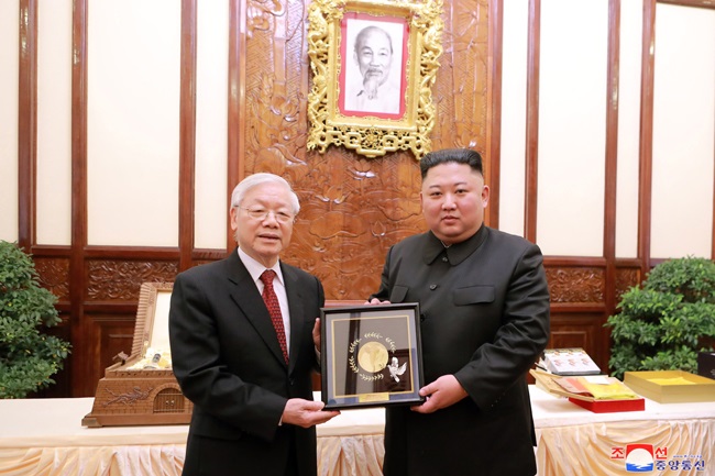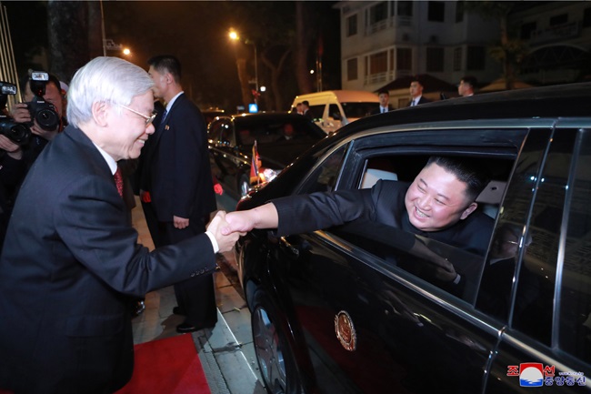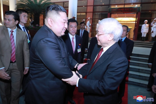 グエン・フー・チョン書記長は祝辞で、金正恩委員長のベトナム訪問を熱烈に歓迎し、このたびの訪問は1964年の金日成主席のベトナム訪問以来、55年ぶりの初の訪問として、ベトナムとの伝統的な友好関係を重視する朝鮮労働党と共和国政府の立場の表れである、ホー・チミン主席と金日成主席がもたらし、手間隙かけて構築した両国の党と、国家、人民の間の伝統的な友好関係はあらゆる挑戦を跳ね除けて絶えず継承され、発展してきた、ベトナムと朝鮮との外交関係設定70周年を控えて行われた金正恩委員長のこのたびの訪問が、両国の人民の利益と世界の平和、安定、協力、発展に大いに寄与するものと確信する、ベトナムと朝鮮は遠く離れていても心は近くにあり、実の兄弟と同じである、ベトナムと朝鮮との伝統的な友好関係が絶えず発展することを祈ると述べました。
