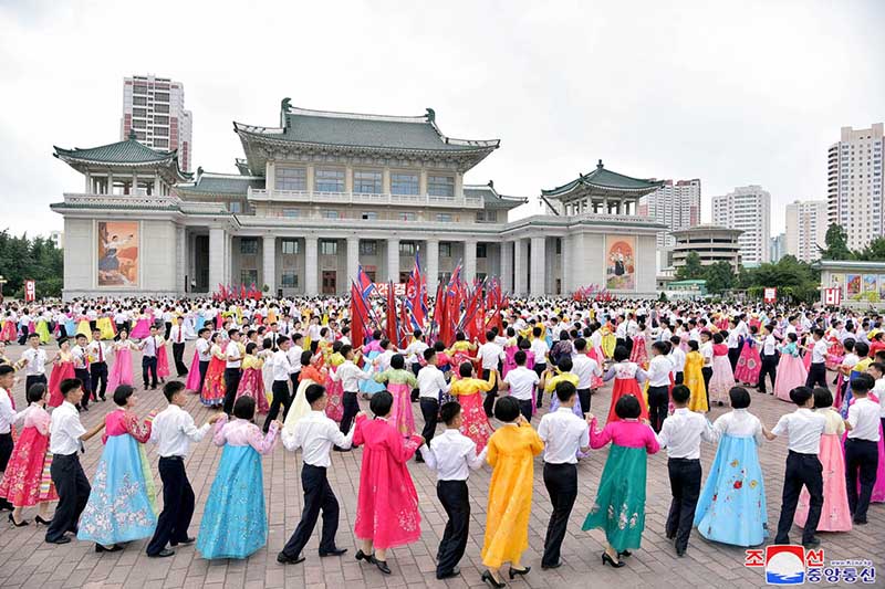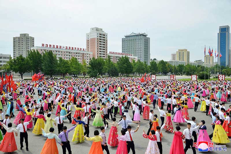 凱旋門広場とピョンヤン体育館広場など、ピョンヤンの舞踏会場で青年たちは「われらの将軍一番さ」、「将軍咲かせた先軍のおかげ」、「人民の喜び」などの歌に合わせて踊りの輪を広げました。