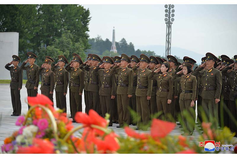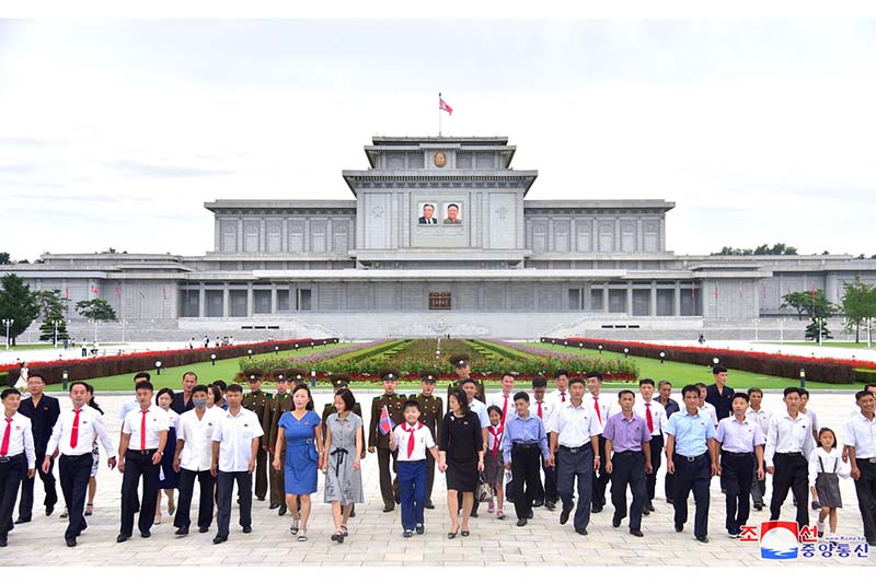 チュチェの最高聖地であるクムスサン太陽宮殿を訪れた人民軍軍人と人民は、卓越した軍事思想と非凡な用兵術で人民軍を無敵必勝の精鋭な革命強兵につくって、社会主義偉業の成功のための強力な軍事力をもたらした偉大な金日成主席と偉大な金正日国防委員長に感謝の思いを込めてふかぶかとおじぎをしました。