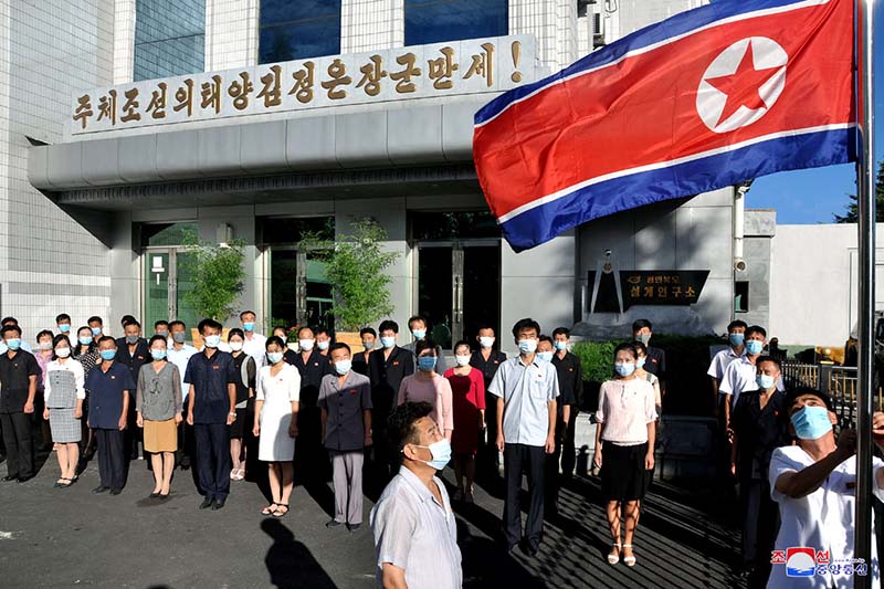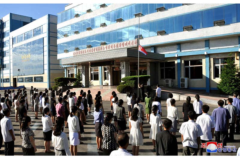 荘重に鳴り響く朝鮮民主主義人民共和国の国歌を崇高な気持ちで口ずさみながら人民軍軍人と各地の勤労者、青年学生は空高くなびく国旗に敬意を表しました。
