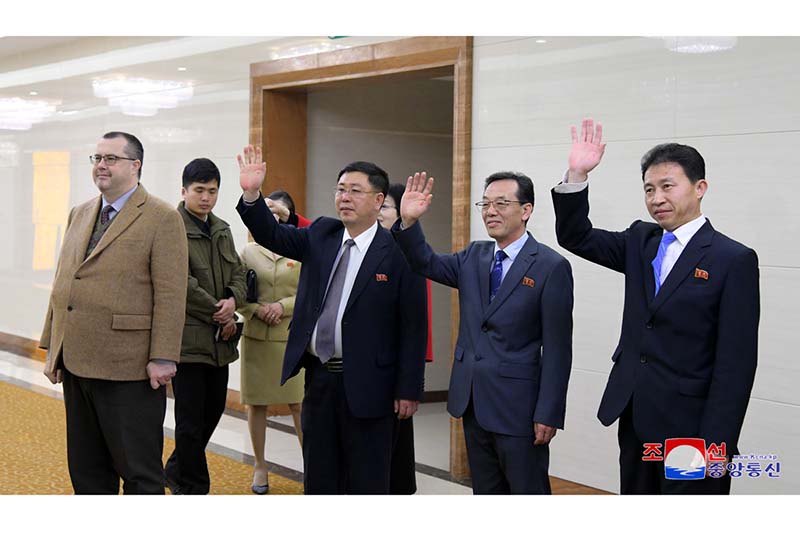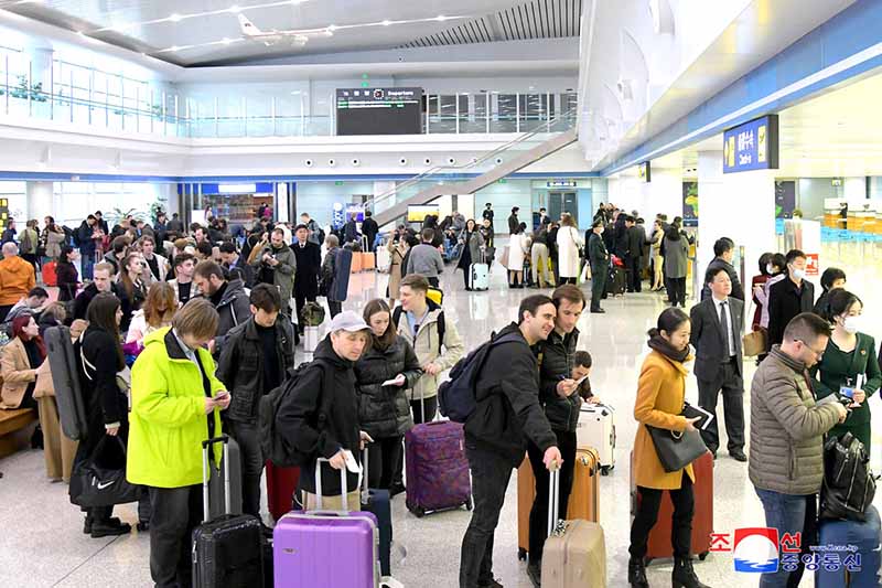 ピョンヤン国際空港で朝鮮民主主義人民共和国のパク・キョンチョル副文化相と関係者、駐朝ロシア連邦大使館のウラジーミル・トペハ公使参事と大使館員が見送りました。