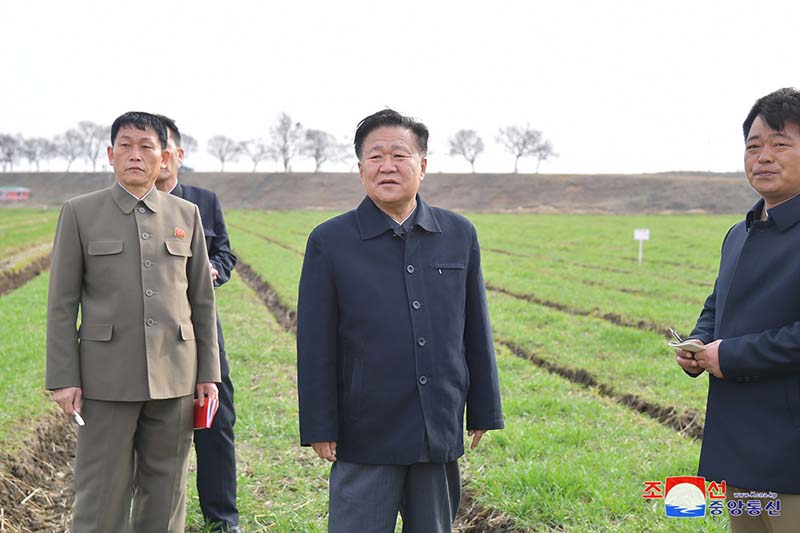 チェ委員長は農場の各所を見て、当面の営農工程の遂行に身を入れているここの人たちを励まし、穀物増産のための実務的対策を前持って立てることに触れました。