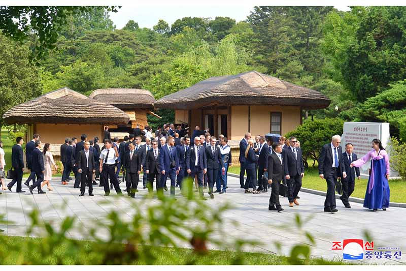 一行は、マンギョンデの生家の前で金日成主席の栄えある革命歴史とマンギョンデ一家の愛国的生涯についての解説を聞き、大事に保存されている物件資料に見入りました。