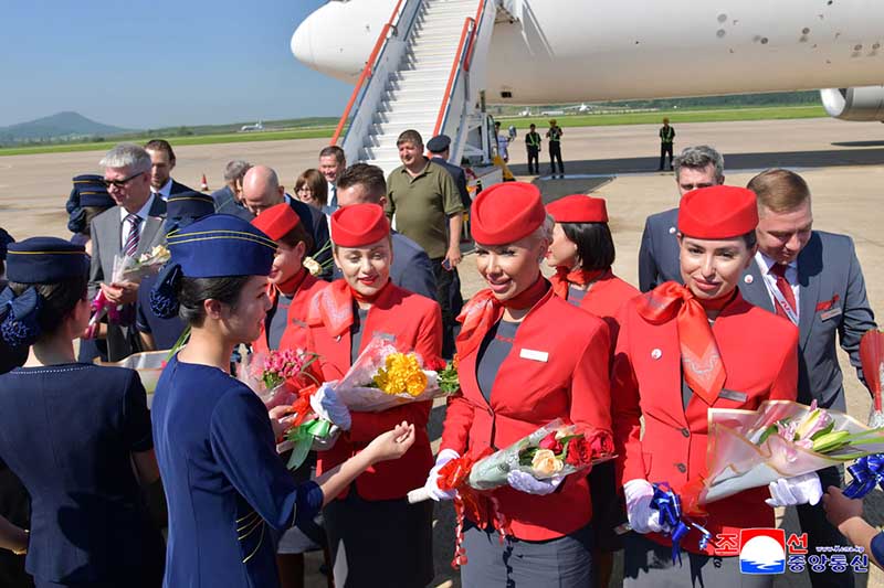 朝鮮のスチュワーデスがロシアの乗組員に花束を持たせ、熱く歓迎しました。