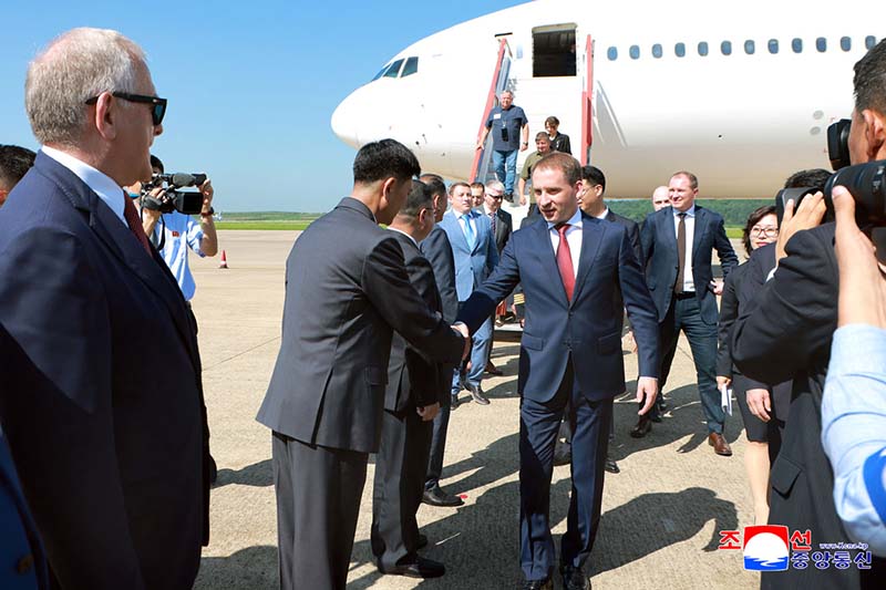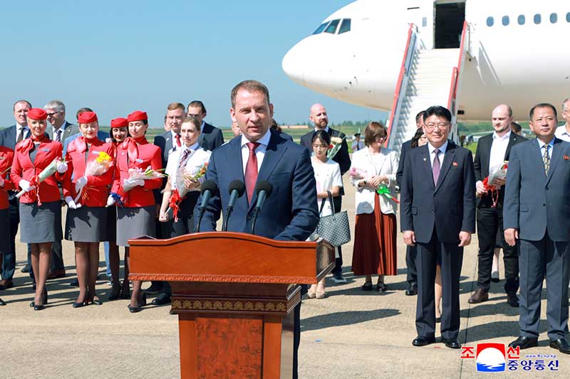 朝ロ政府間貿易経済及び科学技術協力委員会朝鮮側委員長のユン・ジョンホ対外経済相と関係者、アレクサンドル・マツェゴラ駐朝ロシア連邦特命全権大使と大使館員がピョンヤン国際空港に一行を出迎えました。