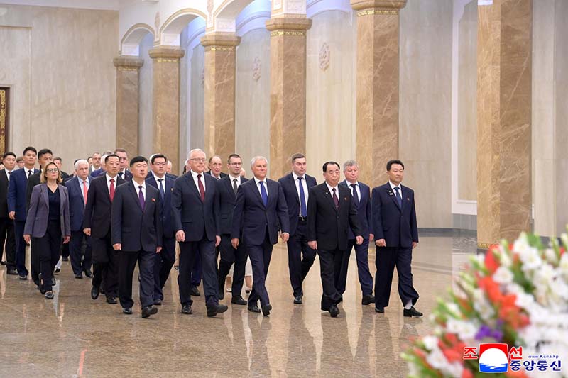 ビャチェスラフ・ウォロジン議長率いるロシア連邦国家会議代表団が14日、午前、クムスサン太陽宮殿を訪れ、偉大な金日成主席と偉大な金正日国防委員長に敬意を表しました。