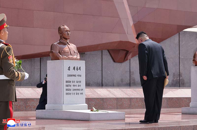 金正恩総書記は透徹した精神と熱血の愛国心を抱いて抗日戦争に勇躍起ち上がり、血潮で独立を勝ち取った革命の第一世代の不滅の功績と誉れ高い人生を敬虔な気持ちで思い起こし、呉振宇(オ・ジンウ)、呉白竜(オ・ベクリョン、オ・ペクリョン)、金一(キム・イル)、崔春国(チェ・チュングク)、姜健(カン・ゴン)、金策(キム・チェク)、安吉(アン・ギル)、柳京守(リュ・ギョンス)、崔賢(チェ・ヒョン)、林春秋(リム・チュンチュ)の各同志の胸像に花を捧げました。
