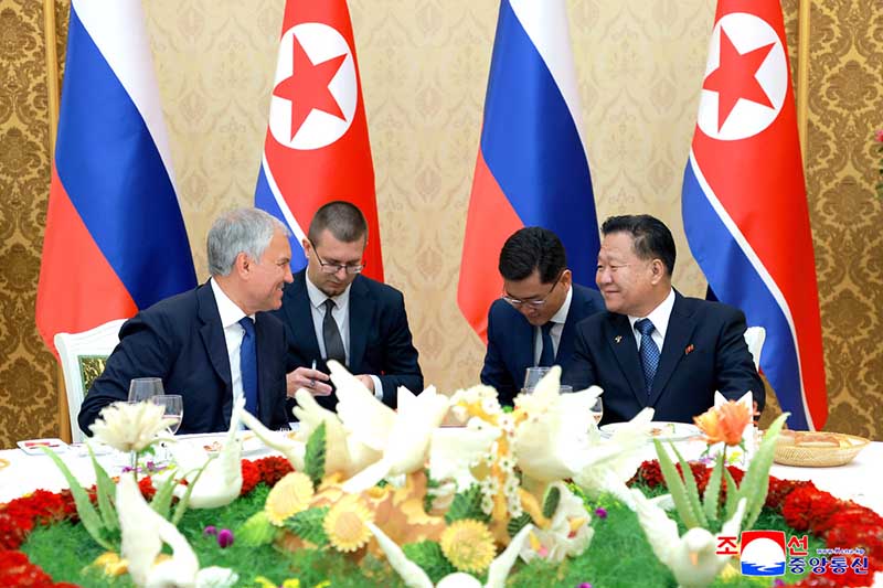 朝鮮民主主義人民共和国最高人民会議が、祖国解放80周年に際して朝鮮を祝賀訪問したロシア連邦国家会議代表団を歓迎して、14日の夕刻、マンスデ議事堂で宴会を催しました。