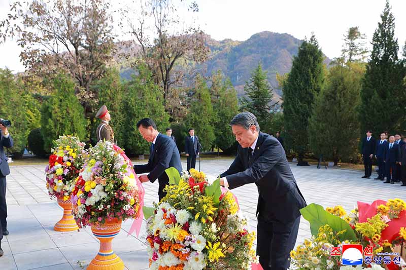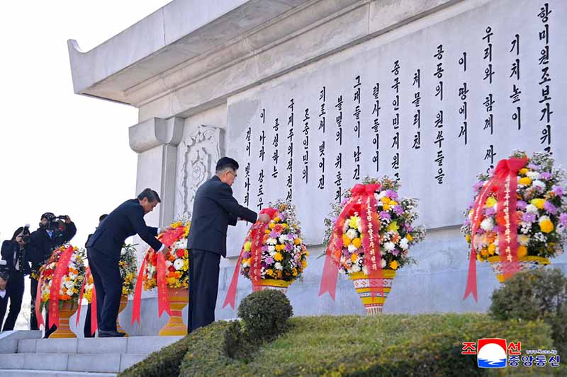 朝鮮労働党中央委員会、朝鮮労働党中央軍事委員会、朝鮮民主主義人民共和国内閣の名義の花かごと中国共産党中央委員会、中華人民共和国国務院、中国共産党中央軍事委員会と中華人民共和国中央軍事委員会の名義の花かごが捧げられました。