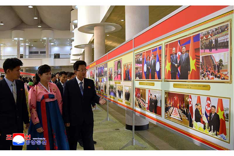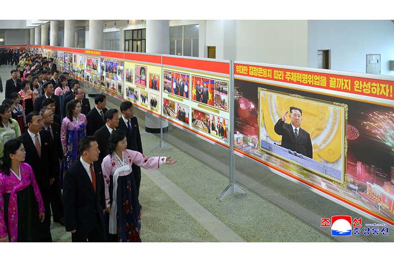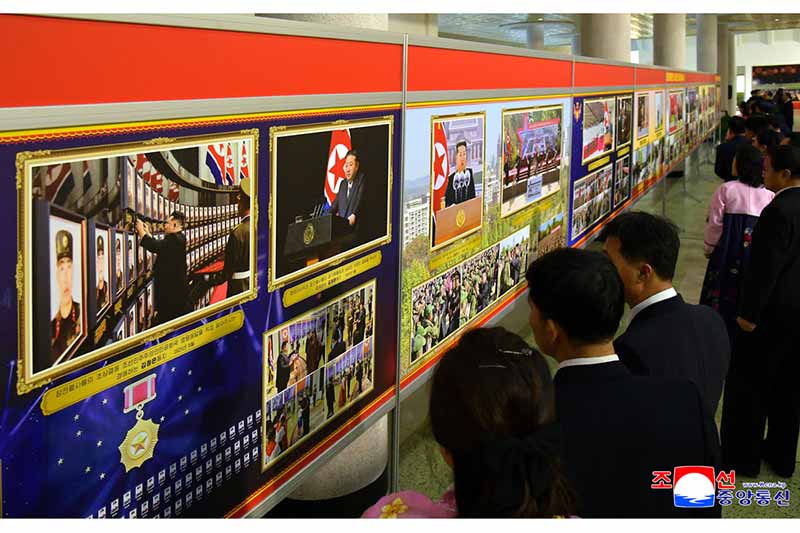 会場には自主、自立、自衛を変わらない革命路線に示し、歴史的な朝鮮労働党第8回大会が示した革命綱領の実行のための人民挙げての闘争を正しく導いて、国の繁栄の新しい転機を開く敬愛する金正恩総書記の写真が展示されています。