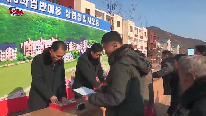 黄海南道と長淵郡の人と建設者、農業勤労者が参加した新居入りの集いで祝辞に次いで住宅利用の証書が手渡されました。